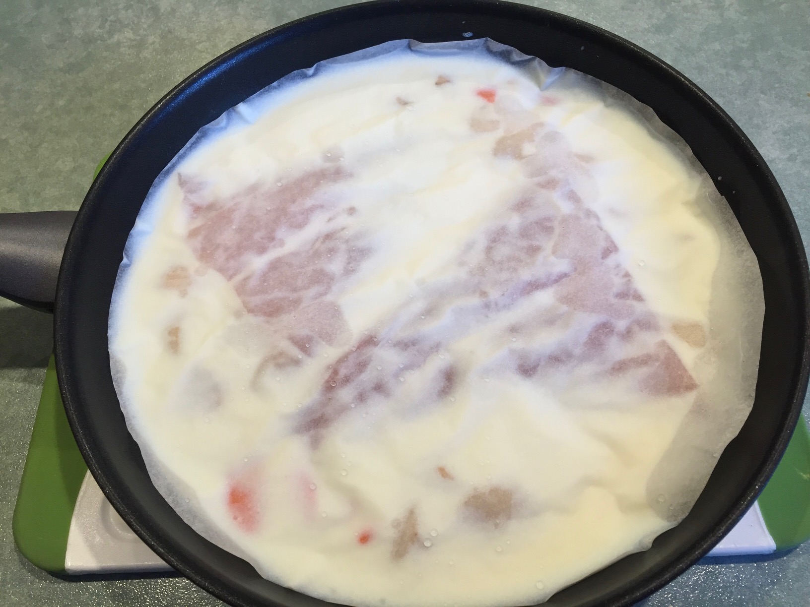 Meanwhile, we had prepared the milk for our béchamel sauce, bringing it to a gentle simmer, turning the heat off and leaving it to infuse until it was lukewarm. We strained the milk over the seafood, covered it with the recommended damp sheet of baking paper and placed the pan over a low heat until it began to simmer.