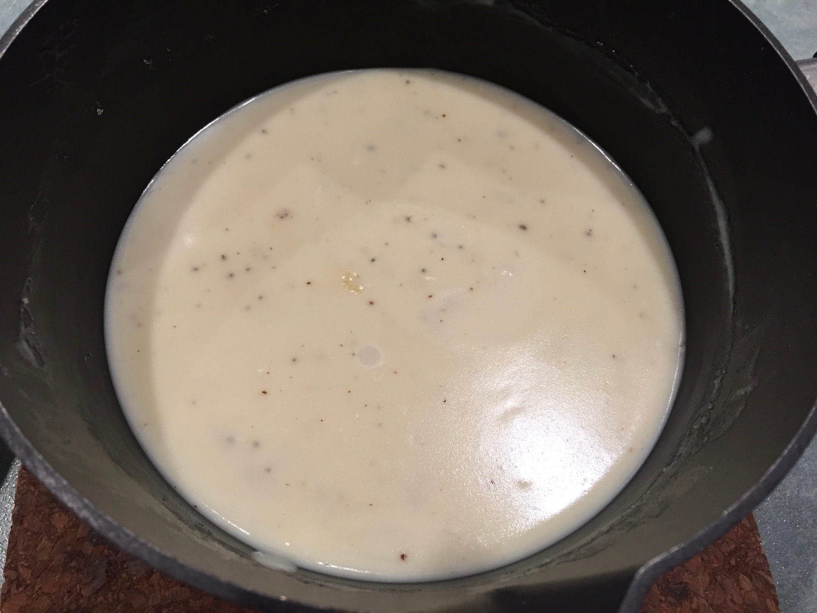 So, Maggie and I had a good look at the instructional video and decided we’d be happy to give it a go, noting that the method included a true, classic béchamel sauce, in which milk is infused with the flavours of a bay leaf, black peppercorns and slices of white onion.