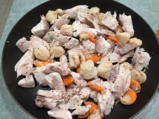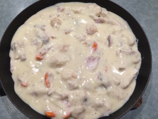 The fish, which had been flaked into chunks, and the scallops were returned to the pan and smothered in the sauce.