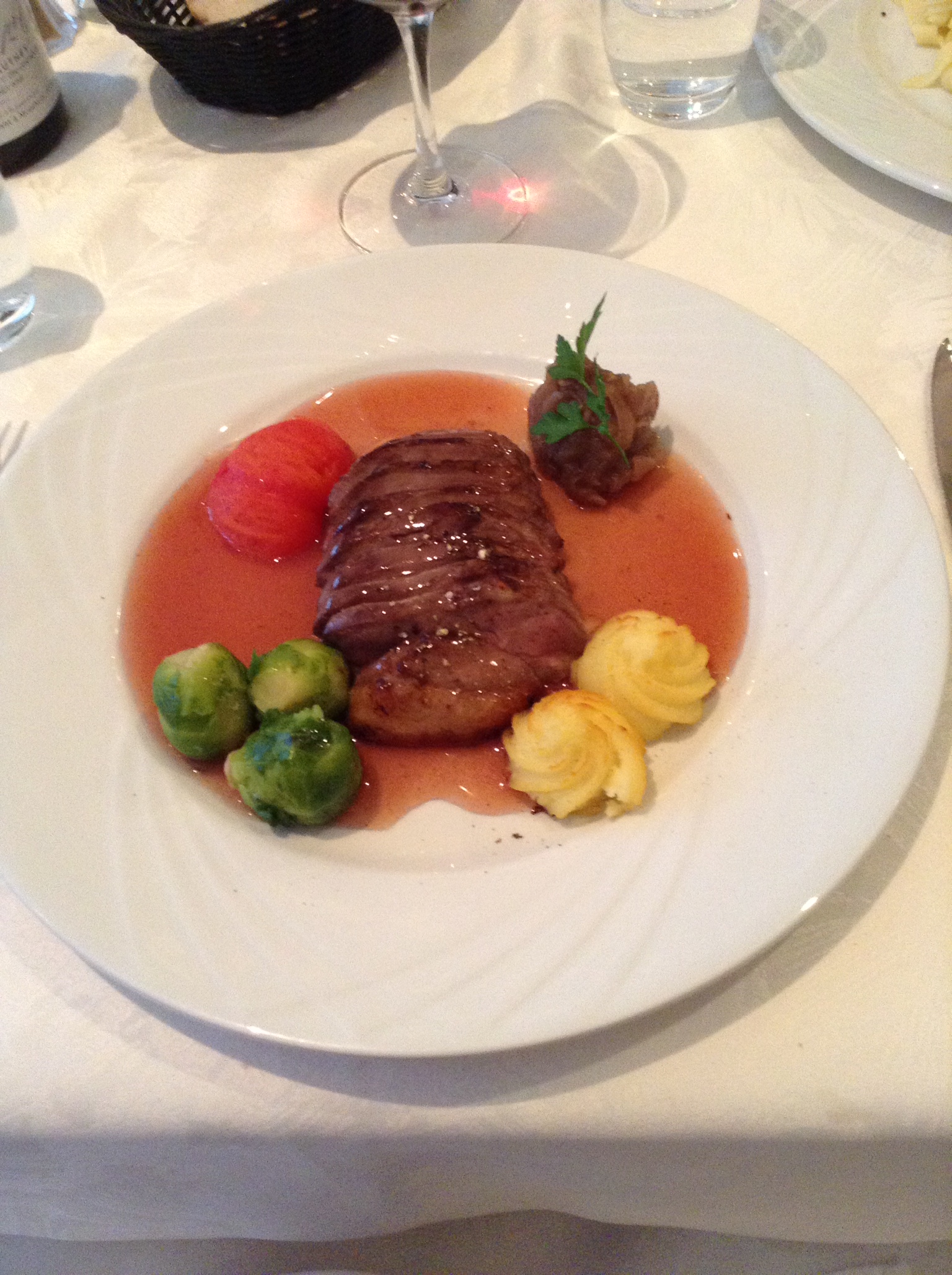 Our hosts recognised us and arranged that we receive a different amuse bouche – a sample of the house ham and parsley terrine; this is now a dish we will try to make in our kitchen. For an entree, Maggie had six escargots, in the traditional style; she was very satisfied. I had a salad of fresh leaves tossed with various grilled small crustaceans and a dressing that played its part with subtlety; delicious, yet deceptively simple.