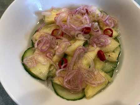 Having recently returned from Vietnam, where sweet & sour salads are commonplace, we jumped at the opportunity to make this dish. All the more so, because we had hot, cayenne chillies growing in our garden.