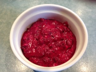 - When the beetroot wedges have cooled, process them with the vegetable stock. For the terrine, process only briefly to produce a blend that includes plenty of visible small chunks